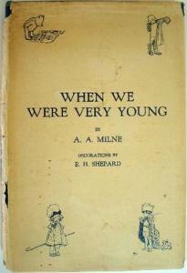 Christopher Robin’s first published appearance as a character, for instance, was in the poem “Vespers” (whose most famous line is “Christopher Robin is saying his prayers”). It appeared in the January 1923 issue of Vanity Fair, and is already in the public domain in the US, as of the start of this year. Beginning in January 1924, Milne published more children’s poems featuring Christopher Robin and others in Punch, which were republished later in the year in the book When We Were Very Young. That book was an international best-seller, and along with the later book Winnie-the-Pooh, it launched Milne, his son, and his stuffed toys to worldwide fame and fortune (which, as I noted in last year’s post on Milne’s Success, was at best a mixed blessing for them.)